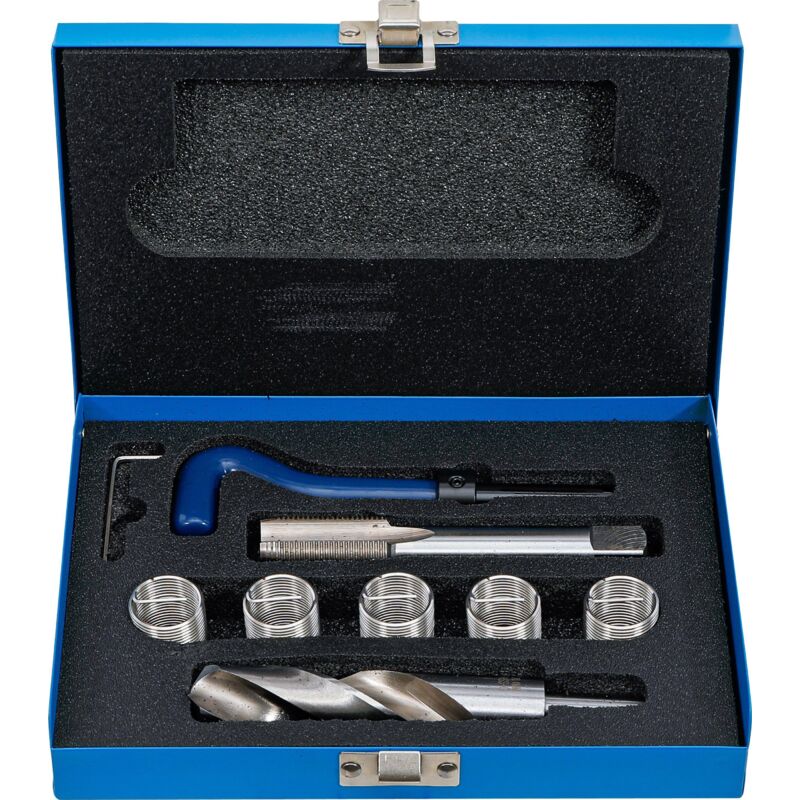 Per la riparazione di filetti danneggiati o usurati per nuovi filetti ad alta resistenza e lunga durata ideale per manutenzione e montaggio la riparazione viene eseguita in pochi passaggi eliminare le filettature danneggiate con la punta elicoidale utilizzare il maschio speciale per tagliare il filetto ricevente nel foro praticato per installare, posizionare l'inserto filettato sull'utensile per inserimento e svitarlo avvitare l'inserto filettato esercitando una leggera pressione si consiglia l'uso di olio da taglio Oggetto della fornitura: 1 punta elicoidale HSS | Dimensioni preforo 20,4 mm | per BGS 9434 (BGS 99434-1) 1 maschiatore monotagliente STI | HSS-G | M20 x 1,5 mm 1 utensile per inserimento con anello di bloccaggio 5 inserti filettati | M20 x 1,5 mm Peso del tessuto 1.028 Per filettatura/passo M20 x 1,5 Dimensioni dell'imballaggio 1 Peso lordo 1028 g