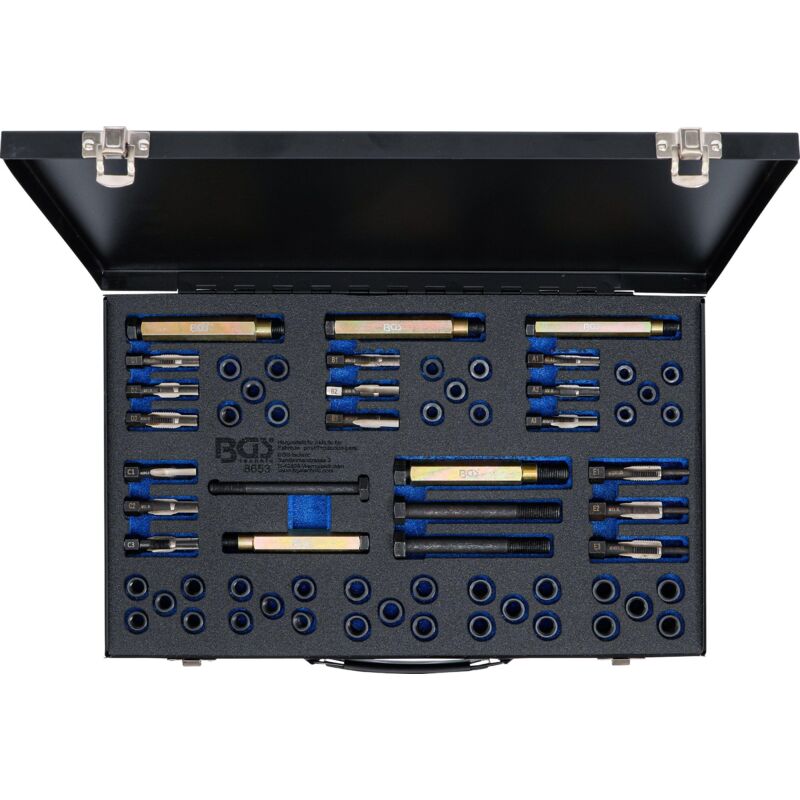 Per riparare la filettatura della sede della candela di preriscaldamento nella testa del cilindro Oggetto della fornitura: 5 alesatori per alesare la filettatura originale M8 x 1,0 mm - M9 x 1,0 mm - M10 x 1,0 mm - M10 x 1,25 mm - M12 x 1,25 mm 5 maschiatori per manicotti filettati M8 x 1,0 mm - M9 x 1,0 mm - M10 x 1,0 mm - M10 x 1,25 mm - M12 x 1,25 mm 5 maschiatori per ripassare la filettatura originale M8 x 1,0 mm - M9 x 1,0 mm - M10 x 1,0 mm - M10 x 1,25 mm - M12 x 1,25 mm 5 utensili di montaggio per inserire i manicotti filettati 5 manicotti filettati M8 x 1,0 mm (lunghezza 11 mm) 5 manicotti filettati M9 x 1,0 mm (lunghezza 11 mm) 5 manicotti filettati M10 x 1,25 mm (lunghezza 12 mm) 5 manicotti filettati M10 x 1,0 mm (lunghezza 12 mm) 5 manicotti filettati M10 x 1,0 mm (lunghezza 19 mm) 5 manicotti filettati M12 x 1,25 mm (lunghezza 12 mm) 5 manicotti filettati M12 x 1,25 mm (lunghezza 19 mm) 5 manicotti filettati M12 x 1,25 mm (lunghezza 26 mm)