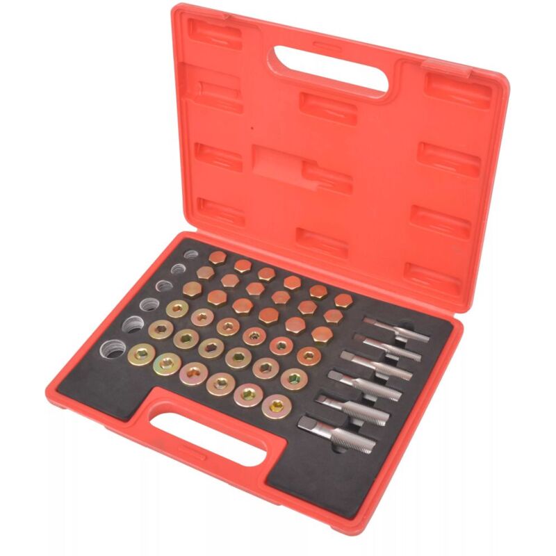 Descrizione: Questo kit completo per la riparazione delle filettature dei tappi di scarico dell'olio a sei dimensioni, tappi di scarico olio e rondelle si adatta a quasi tutte le applicazioni. è ideale per la riparazione di filettature del pozzetto, del cambio e del differenziale. Questo kit fornisce viti di tappo di scarico nuovi allargati e di sostituzione per l'uso quando i filetti esistenti sono danneggiati o usurati. è adatto per la maggior parte dei filetti utilizzati sugli automobili e veicoli commerciali leggeri come Audi, VW, BMW, Citroen, Fiat, Ford, Seat, Honda, Mazda, Mitsubishi, Opel, Peugeot, Renault, Toyota e Volvo. Realizzato in materiali di alta qualità, il kit è stato progettato per una lunga durata in officina. Tutti gli strumenti sono forniti in un custodia per facilitare lo stoccaggio e il trasporto. Specificazioni: Set completo per la riparazione dei filetti dei tappi di scarico dell'olio Sei dimensioni popolari (M13 - M22) si adattano a quasi tutte le
