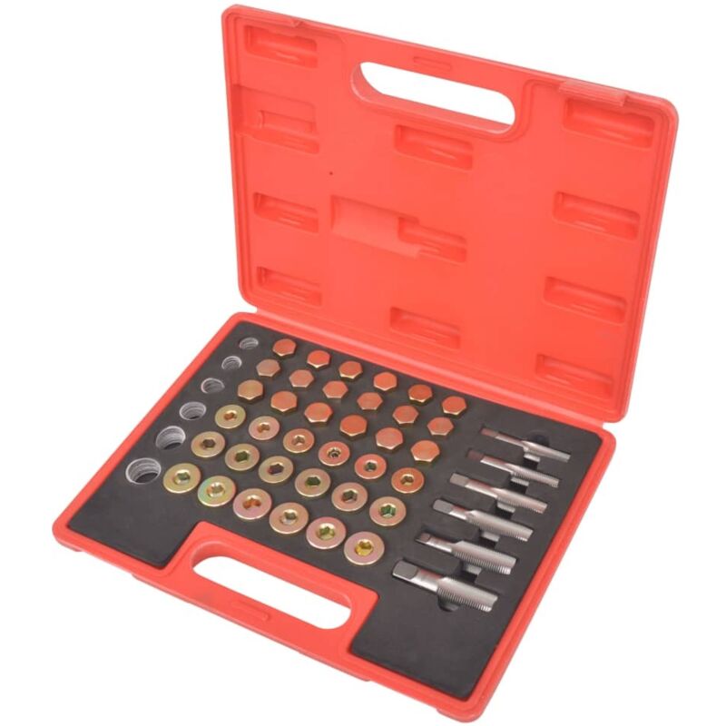 Questo kit completo per la riparazione delle filettature dei tappi di scarico dell'olio a sei dimensioni, tappi di scarico olio e rondelle si adatta a quasi tutte le applicazioni. È ideale per la riparazione di filettature del pozzetto, del cambio e del differenziale. Questo kit fornisce viti di tappo di scarico nuovi allargati e di sostituzione per l'uso quando i filetti esistenti sono danneggiati o usurati. È adatto per la maggior parte dei filetti utilizzati sugli automobili e veicoli commerciali leggeri come Audi, VW, BMW, Citroen, Fiat, Ford, Seat, Honda, Mazda, Mitsubishi, Opel, Peugeot, Renault, Toyota e Volvo. Realizzato in materiali di alta qualità, il kit è stato progettato per una lunga durata in officina. Tutti gli strumenti sono forniti in un custodia per facilitare lo stoccaggio e il trasporto. Specificazioni: Set completo per la riparazione dei filetti dei tappi di scarico dell'olio Sei dimensioni popolari (M13 - M22) si adattano a quasi tutte le applicazioni Design di