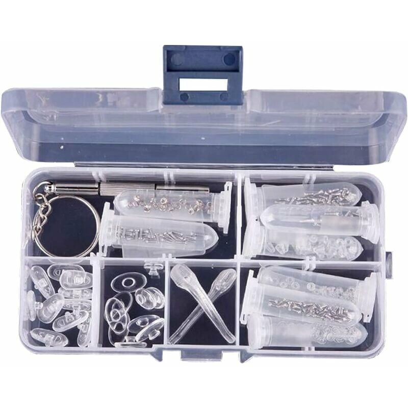 Durevole: realizzato in silicone di alta qualità, plastica e acciaio inossidabile, antiruggine, resistente e di lunga durata Caratteristiche complete: contiene molti tipi di piccole viti, dadi, rondelle, rondelle, naso e ganci per le orecchie Facile da trasportare: con custodia, leggero, di piccole dimensioni, facile da trasportare e facile da usare Facile da riporre: con scomparto organizer con scomparti interni per una facile conservazione di viti e dadi per evitare perdite Ampia applicazione: inclusi naselli e altre parti, possono essere utilizzati per riparare occhiali, occhiali da vista, occhiali da sole, gioielli per orologi, ecc.