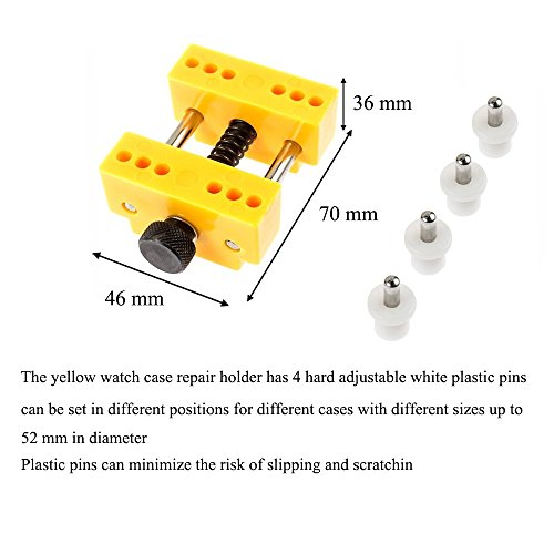 【Portaorologio per orologio】 Il supporto per riparazione orologio giallo ha 4 piedini in plastica bianca regolabili rigidi, può essere impostato in posizioni diverse per casi diversi con dimensioni diverse fino a 52 mm di diametro, i perni in plastica possono ridurre il rischio di scivolamento e graffi