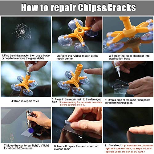 Facile da usare: per riparare piccole vetro leggermente incrinato, pulire e asciugare la superficie del vetro prima dell'applicazione e pressare la resina nelle crepe, quindi applicare la striscia indurente, lasciare asciugare e indurire sotto la luce UV per 5-10 minuti, infine raschiare la resina rimanente con una spatola.