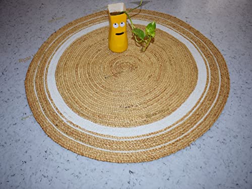 Ripaz - Tappeto in iuta naturale con linea bianca bianca, intrecciato a mano, 240 x 240 cm, rotondo