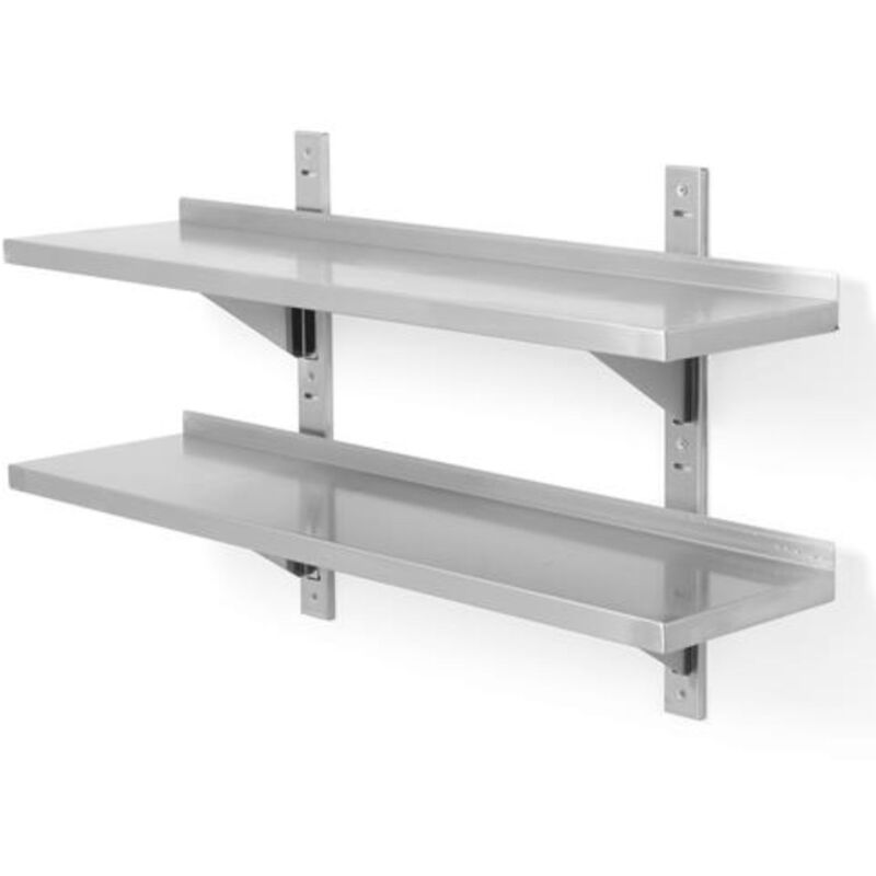 Attrezzatura supplementare per ogni cucina e sala di preparazione2 ripiani regolabili facilitano l'adattamento alle vostre esigenzeMontaggio a pareteRealizzato in acciaio inox AISI 430Il bordo posteriore protegge la merce dalle caduteLa possibilità di smontaggio e la superficie liscia dei ripiani facilitano il lavaggioMax. carico uniforme sugli scaffali: 25 kg Struttura saldata che garantisce elevata durata e stabilità Include 2 console da appendere al muro