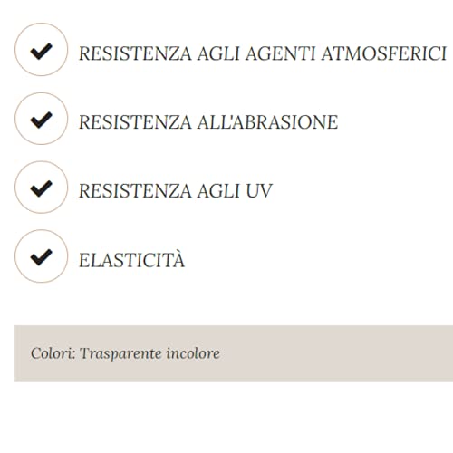 RESISTENZA AGLI AGENTI ATMOSFERICI - RESISTENZA ALL'ABRASIONE - RESISTENZA AGLI UV - ELASTICITÀ - Colori: Trasparente incolore