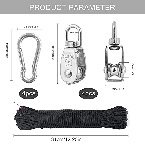 Combinazione perfetta: include 4 blocchi per puleggia M15, 4 moschettoni a moschettone, 31 metri/4 mm corda in nylon. Blocco puleggia M15, carico massimo 35 kg, moschettone a molla, carico massimo 200 kg, 4 mm x 31 m, tensione massima 100 kg.