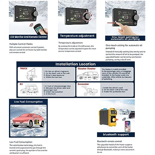 Installazione semplice: tutto in uno: la struttura compatta di questo riscaldatore di parcheggio lo rende facile da installare e può essere smontato e installato in una nuova auto quando si cambia veicolo. L'uso di una tecnologia di controllo automatico avanzata garantisce un funzionamento affidabile in condizioni anomale.