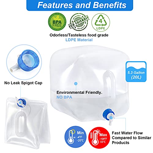 DISPONIBILITÀ DI DIVERSE DIMENSIONI E CONFEZIONI - 2,6 galloni (10L), 5,3 galloni (20L), doppi 2,6 galloni (10L) e doppi 5,3 galloni (20L) sono disponibili per usi e scopi diversi. Eccellente per campeggio, camper, caccia, escursionismo, zaino in spalla, pesca, picnic, barbecue, sport, festival, feste, spiaggia e altre attività all'aperto.