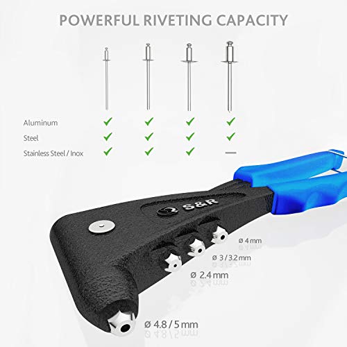 S&R Rivettatrice Manuale Professionale con 60 Rivetti (2,4 mm, 3,0/3,2 mm, 4,0 mm, 4,8/5,0 mm) per alluminio e acciaio Inox per fori ciechi, 4 dadi, 1 chiavetta, 1 comoda scatola
