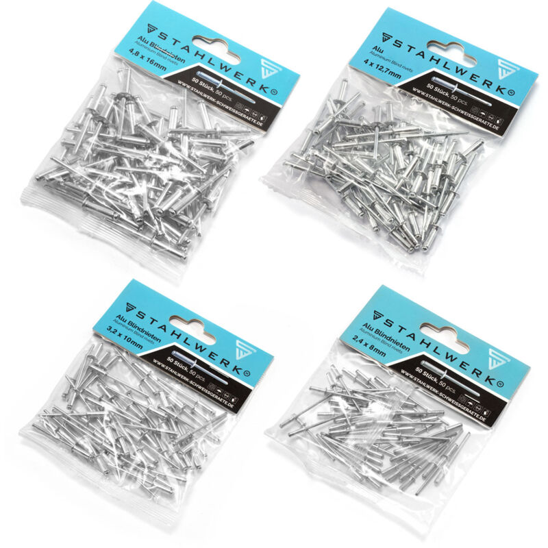 STAHLWERK set di 4 rivetti ciechi in alluminio 2,4 x 8 mm + 3,2 x 10 mm + 4 x 12,7 mm + 4,8 x 16 mm per pinze per rivetti ciechi I rivetti ciechi si usano sempre quando non è possibile un collegamento con viti e dadi e l'accesso al collegamento è possibile solo da un lato. I rivetti ciechi in alluminio STAHLWERK possono essere utilizzati per creare rapidamente e facilmente fissaggi meccanici permanenti con lunghezze di serraggio ridotte. I rivetti ciechi in alluminio STAHLWERK possono essere utilizzati per unire rapidamente materiali diversi, ad esempio metallo e plastica, con un accoppiamento forzato. Caratteristiche Realizzati in alluminio per rivetti robusti ed elevata resistenza strutturale. Buona distribuzione del carico e sistema di bloccaggio del mandrino. Crea rapidamente e con poco sforzo una giunzione strutturale permanente e ad alta resistenza. Resistente alla corrosione e durevole. Installazione semplice e pulita. Dati tecnici Tipo di rivetto: Cieco Diametro del rivetto