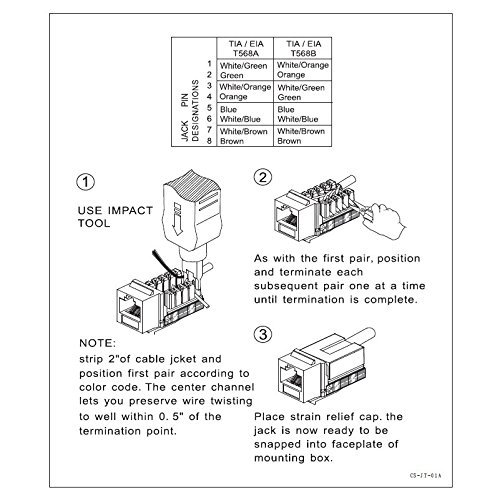 Il blocco keystone RJ45 Cat6 supporta il cablaggio T568A e T568B con blocchi 110 codificati a colori Supporta terminazioni di tipo doppio 110 o Krone e accetta cavi Ethernet solidi 23 o 24 AWG.