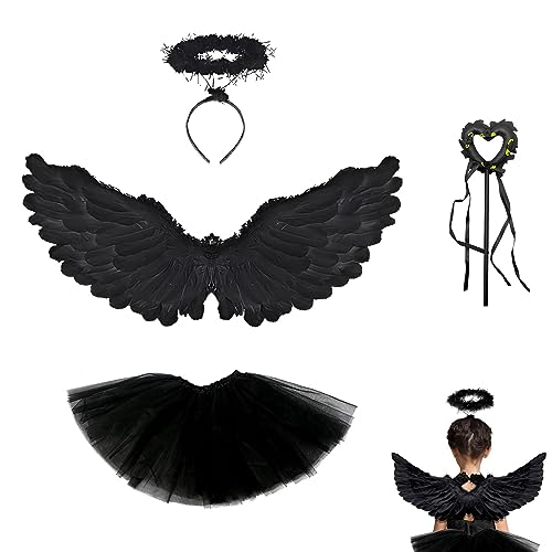 Rkllejs Ali Angelo Nero, 60CM Ali Angelo pimonte, Costume Angelo Donna con Cerchietto, Bacchetta Magica e Gonna Tutù Nero, Ali Angelo Costume, per Natale, Halloween, Carnevale, Cosplay, Compleanno