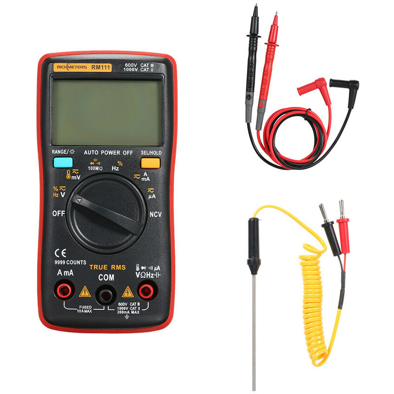 Questo prodotto è alimentato a batteria con true-rms, display a LED e retroilluminazione. Il modello di multimetro digitale può misurare tensione CA / CC, corrente CC, resistenza, continuità, diodi, transistor hFE e così via. Portatile e facile da usare. Può servire bene nel campo della manutenzione di auto, ingegneria elettrica e laboratori didattici, ecc. Caratteristiche: Con un ampio display LCD retroilluminato, la data può essere mostrata chiaramente. facile da leggere al buio. Di piccole dimensioni, portatile con una custodia, puoi portarlo ovunque tu ne abbia bisogno. Design ergonomico compatto, funzionamento con una sola mano scelta perfetta per la misurazione a mano. Consente vari test elettrici tra cui test di resistenza, tensione CC/CA e corrente con un semplice interruttore. Facile da usare, la gamma automatica misura accuratamente con il chip di autocalibrazione per garantire precisione e stabilità.< br/>Specifiche: Numero modello: RM111 Temperatura operativa: 0 - 40