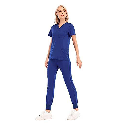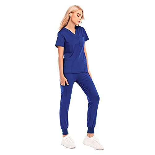 Rmoon Premium | Divisa Sanitaria Medicale Donna - Slim Fit Elasticizzato - Casacca Professionale Completa di Camice e Pantalone per OSS Infermiera (Blu, XS)