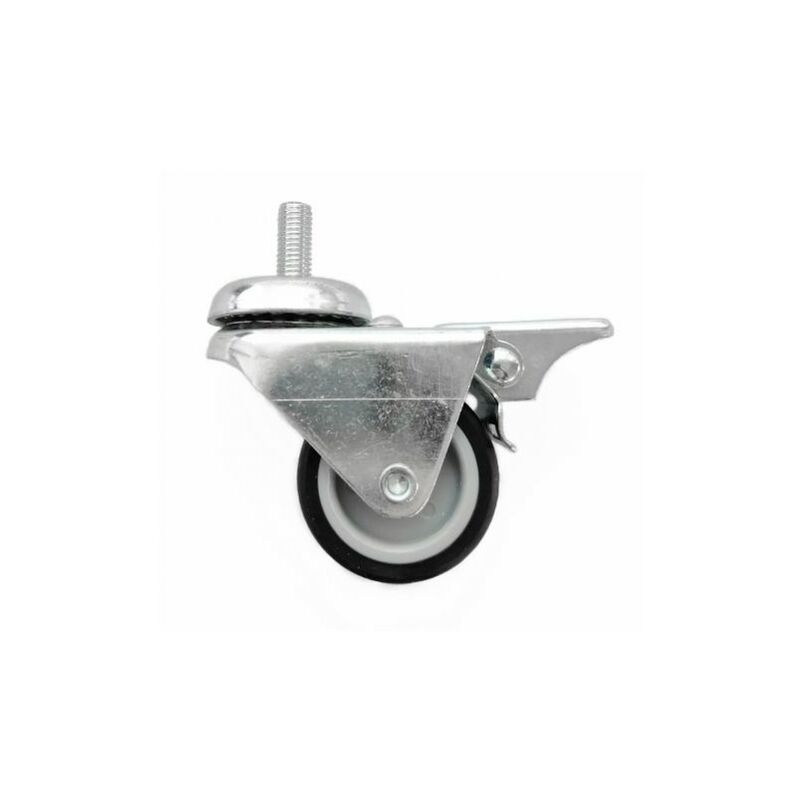 RUOTA PIASTRA GIREVOLE CON FRENO Supporto girevole a perno filettato, a doppio giro di sfere in acciaio stampato, zincato con dispositivo di bloccaggio ruota. Doppia ruota in gomma nera o grigia con nucleo in polipropilene, mozzo a foro passante. Ø 50 mm Spessore ruota 18 mm Altezza ruota 72 mm Perno: 10MAx25 Portata kg 50