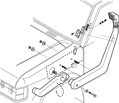 Questo sistema Snorkel trasferisce il punto di presa d' aria del motore da relativamente basso e posizione vulnerabile sotto il cofano/cappuccio per una posizione più alta e più sicuro quando è una fonte costante di aria fresca, pulita, asciutta è disponibile