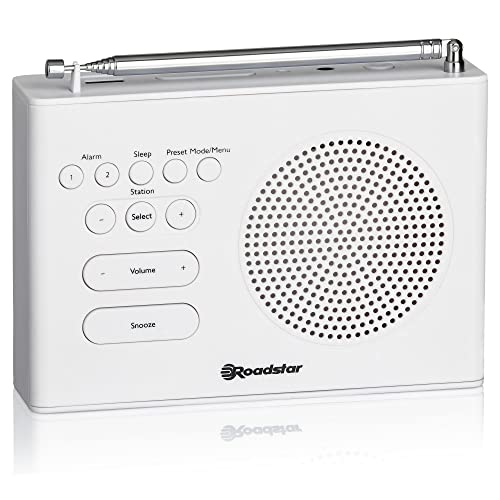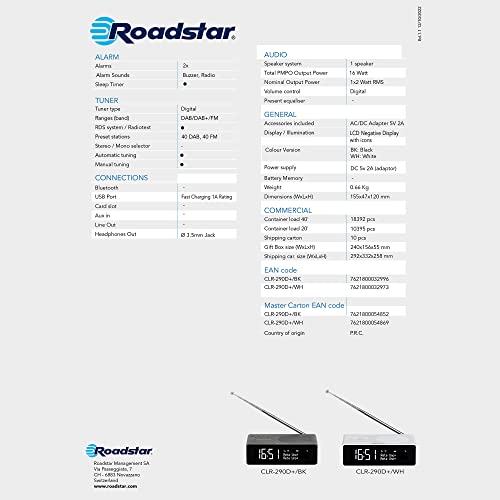 Roadstar CLR-290D+/WH Radiosveglia digitale DAB/DAB+/FM, 2 allarmi, grande display LCD, caricatore USB, funzione snooze, bianco