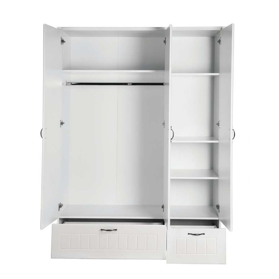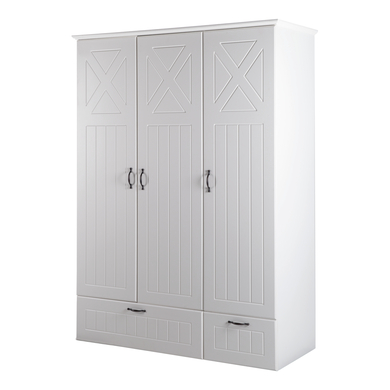 Colorazione della struttura bianco, decorazione dei frontali Canadian White con fresature elaborate, binari metallici, maniglie brunite in stile country house, tecnologia softclose per ante e cassetti. . Dettagli del prodotto: Colore: bianco Materiale della struttura e dei ripiani: truciolato, rivestito in melamina Frontali in materiale: MDF, rivestito Materiale maniglie: Metallo Dimensioni: larghezza x profondità x altezza 137 x 57 x 190 cm 3 ante 1 cassetto largo 1 cassetto stretto 1 binario metallico appendiabiti 4 ripiani Porte con chiusura morbida Cassetti ad estrazione totale