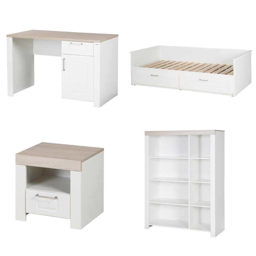 Lettino da giorno Dettagli del prodotto: Colore: bianco Estensibile a letto matrimoniale Con fresature decorative Rete a doghe inclusa 2 cassetti aden senza softclose Dimensioni e peso: Dimensioni: larghezza x lunghezza x altezza 97,5 x 207,5 x 72 cm Superficie di appoggio: 90 x 200 cm Ripiegato: 183 cm di profondità Capacità di carico fino a 90 kg per lato Materiale e cura: Materiale della carcassa: truciolato, rivestito in melamina Materiale frontali: MDF, laminato Maniglie: Metal l Comodino Dettagli del prodotto: Colore: bianco / naturale 1 cassetto 1 scomparto aperto Dimensioni e peso: Dimensioni: larghezza x profondità x altezza 45 x 45 x 41,5 cm Materiale e cura: Materiale della scocca: truciolato, rivestito in melamina Materiale frontali: MDF, laminato Materiale maniglie: Metal l Scrivania Dettagli del prodotto: Colore: bianco / natura Piano d'appoggio decorativo in olmo di tendenza Luna Ante e cassetti fresati aden Il cassetto e l'anta sono dotati di Soft-Close Bordi protettivi in ABS Dimensioni e peso: Dimensioni: larghezza x profondità x altezza 120 x 60 x 75 cm Materiale e cura: Materiale della carcassa: truciolato, rivestito in melamina Materiale frontali: MDF, laminato Materiale maniglie: Metal l Scaffale Play Dettagli prodotto: Colore: bianco / naturale 8 scomparti apertiMisure e peso: Dimensioni: larghezza x profondità x altezza 118 x 41,5 x 156 cmDimensioni interne degli scomparti piccoli: 34 x 34 cmDimensioni interne degli scomparti grandi: 34 x 68 cmMateriale e cura:Materiale: truciolato, rivestito in mel amina Contenuto della fornitura: Letto da giorno Comodino Scrivania Scaffale per giochi Attenzione: il materasso e le decorazioni non sono inclusi nella consegna