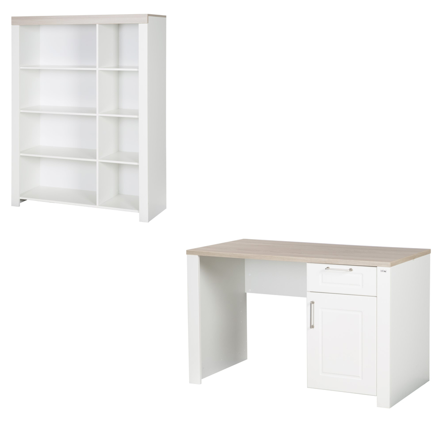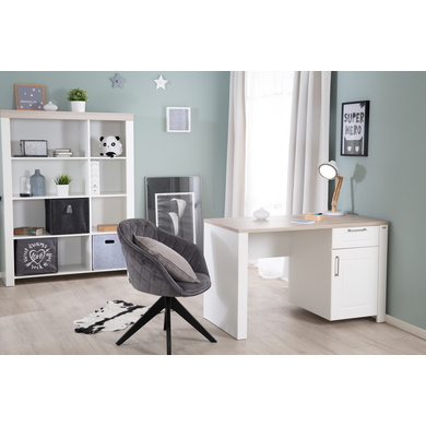 Scrivania Dettagli del prodotto: Colore: bianco / natura Piano del tavolo decorativo in olmo di tendenza Luna Ante e cassetti fresati aden Il cassetto e l'anta sono dotati di Soft-Close Bordi protettivi in ABS Dimensioni e peso: Dimensioni: larghezza x profondità x altezza 120 x 60 x 75 cm Materiale e cura: Materiale della carcassa: truciolato, rivestito in melamina Materiale frontali: MDF, laminato Materiale maniglie: Metal l Ripiano gioco Dettagli del prodotto: Colore: bianco / naturale 8 scomparti aperti Dimensioni e peso: Dimensioni: larghezza x profondità x altezza 118 x 41,5 x 156 cm Dimensioni interne degli scomparti piccoli: 34 x 34 cm Dimensioni interne degli scomparti grandi: 34 x 68 cm Materiale e cura: Materiale: truciolato, rivestito in melamina Contenuto della fornitura: Scrivania Scaffale per giochi Attenzione: la decorazione non è compresa nella fornitura