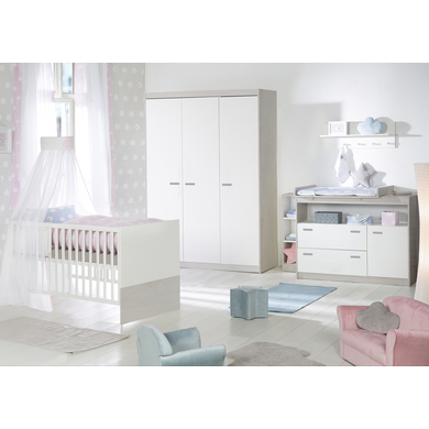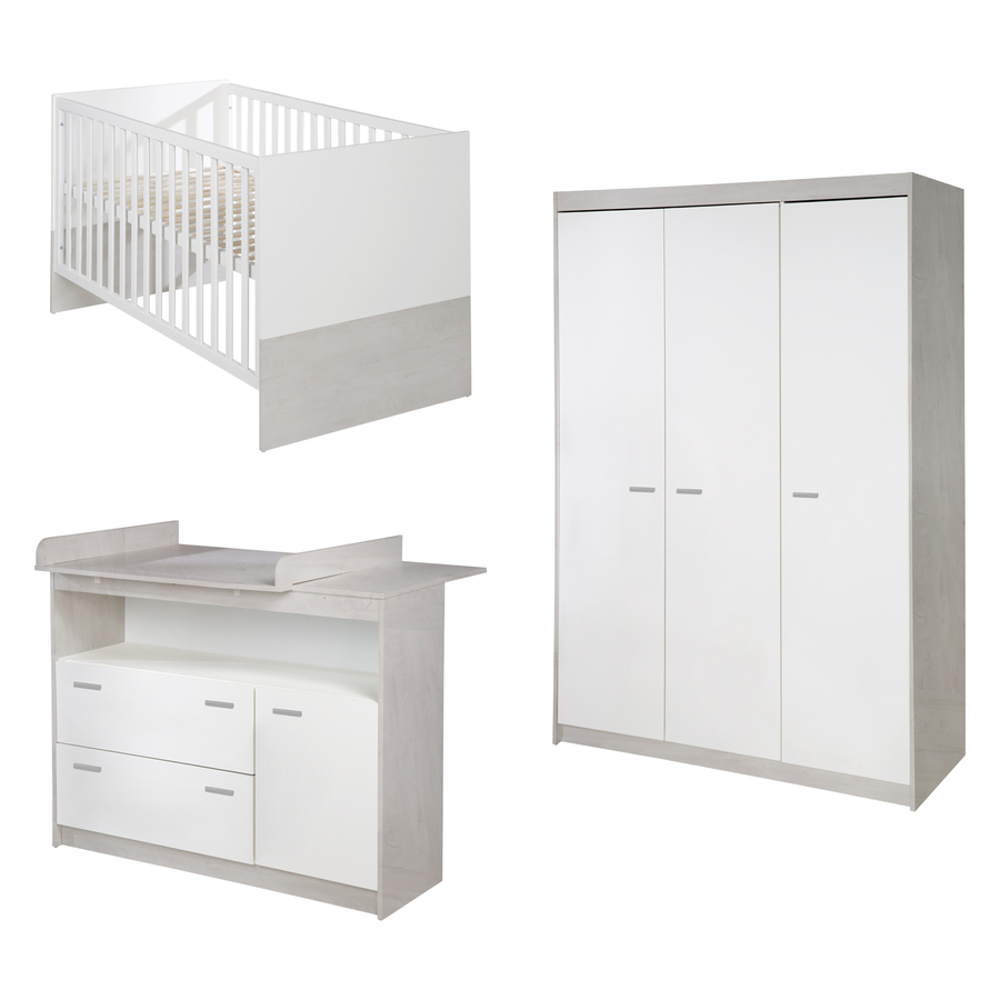 La cameretta roba Julia è composta da un lettino combinato, un fasciatoio e un armadio a 3 ante. Grazie al suo semplice design Design s, il lettino combinato roba Julia è l'alto light nella stanza di un neonato o di un bambino. Il letto per bambini e neonati cresce con il tuo bambino dalla nascita fino all'inizio della scuola. La posizione sdraiata superiore del lettino combinato a 3 posizioni regolabile in altezza è particolarmente facile per voi genitori di un neonato. Da questa comoda altezza di sdraio, puoi sollevare il tuo bambino dal lettino con facilità. In seguito, la posizione intermedia è la scelta perfetta, perché le 3 barre di scorrimento rimovibili nell'elemento del lettino permettono al tuo bambino di entrare e uscire in modo sicuro. Il fasciatoio roba Julia con piano fasciatoio e maniglie in plastica color argento con la sua comoda altezza di 90 cm rende la cura del bambino un piacere per i genitori e per il bambino. Il piano fasciatoio rimovibile può essere montato sopra il fasciatoio. I fasciatoi imbottiti di roba nelle dimensioni 85 cm x 75 cm trasformano il fasciatoio in un comodo fasciatoio nella stanza del bambino. Dietro le sue tre ante con maniglie in plastica di alta qualità, l'armadio roba Julia offre molto spazio di stoccaggio con un appendiabiti e 5 ripiani nella stanza dei bambini o del bambino. Grazie alla sua altezza di quasi 2 m, l'armadio cresce con il bambino fino all'età adulta e può essere utilizzato anche come armadio per la camera dei giovani. Dettagli del prodotto: Lettino combinato Colore: bianco Materiale: truciolato, rivestito in melamina Superficie di sdraio: larghezza x lunghezza 70 x 140 cm Dimensioni: larghezza x lunghezza x altezza 78 x 142 x 80 cm Caricabile fino a 50 kg 3 volte regolabile in altezza 3 pioli di scorrimento Convertibile in letto Junior con sponde di conversione disponibili separatamente Unità di cambio Colore: bianco Materiale: truciolato, rivestito in melamina Materiale della maniglia: plastica Zona cam