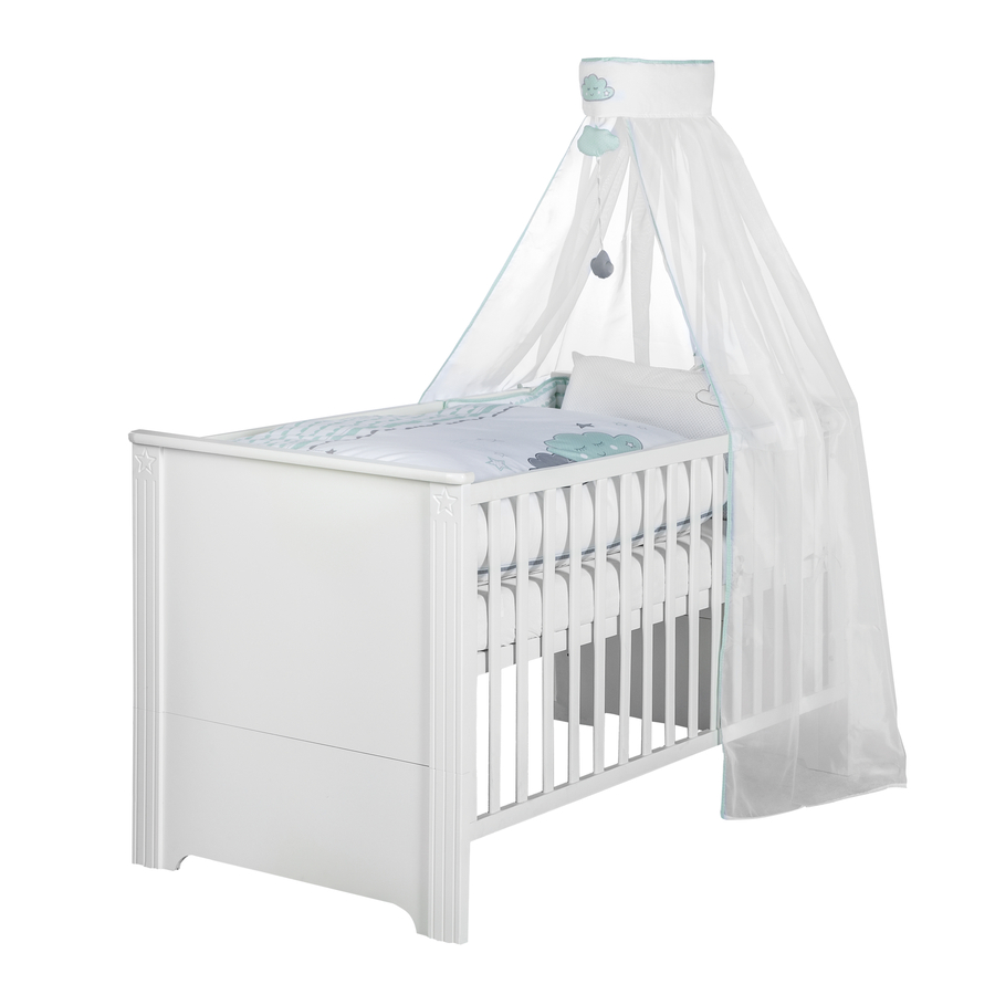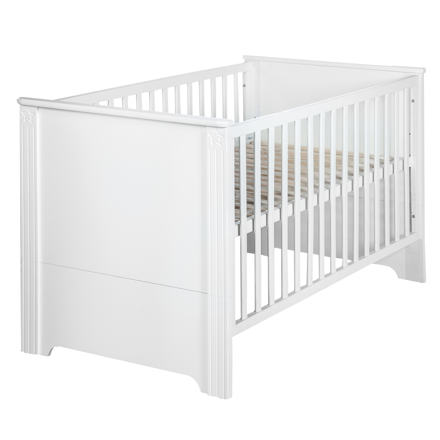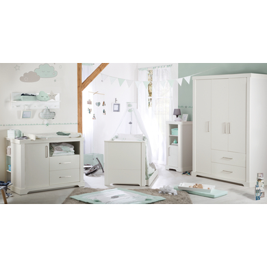 La cameretta per bambini Roba Maxi contiene una culla, un mobile fasciatoio e un armadio a 3 ante. Dettagli del prodotto: Culla Colore: bianco Materiale sbarre / rete a doghe: legno laminato Materiale parte della testa: truciolato, rivestito in melamina Materiale parte dei piedi: MDF, rivestito Superficie di sdraio: larghezza x lunghezza 70 x 140 cm Dimensioni: larghezza x lunghezza x altezza 77 x 147 x 84 cm Barre piatte Regolabile in altezza in 3 posizioni 3 pioli di scorrimento Con elaborata fresatura a stella Trasformabile in lettino per bambini tramite pannelli laterali (disponibili separatamente) Mobile fasciatoio Colore: bianco Materiale corpo / fasciatoio: truciolato, rivestito in melamina Materiale parte anteriore: MDF, rivestito Materiale pannello posteriore: HDF Materiale maniglie: metallo Dimensioni senza fasciatoio: larghezza x profondità x altezza 117 x 41 x 100 cm Dimensioni con fasciatoio: larghezza x profondità x altezza 117 x 78 x 100 cm Altezza fasciatoio: 92 cm Il fasciatoio è rimovibile 1 anta con 2 ripiani 1 scomparto aperto 2 cassetti Armadio Colore: bianco Materiale corpo/fronti: truciolato, rivestito in melamina Materiale telaio: MDF, rivestito Materiale pannello posteriore: HDF Materiale maniglie / barra appendiabiti: metallo Dimensioni: larghezza x profondità x altezza 139 x 54 x 199 cm 3 ante 2 cassetti 1 barra appendiabiti 5 ripiani Incluso nella consegna: Culla Rete a doghe Mobile fasciatoio Fasciatoio Armadio Attenzione: decorazioni, ripiano laterale e pannelli laterali non inclusi.