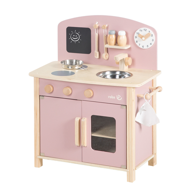 La cucina da gioco roba è una vera meraviglia. Perché un vero talento culinario sviluppa le sue capacità anche in una piccola cucina per bambini. Non ci sono limiti all'immaginazione e il tuo bambino si divertirà molto a preparare i propri piatti. Ha un fornello con 2 zone di cottura, un forno, una credenza e un lavandino con un rubinetto con 2 manopole decorative. Proprio come in una vera cucina, le 3 manopole per il piano cottura e il forno possono essere girate. La finestra trasparente sul forno permette al bambino di tenere d'occhio il cibo o la torta. Con l'aiuto dell'orologio e delle sue lancette rotanti, l'apprendimento è incoraggiato in modo giocoso. Il design semplice con una piccola lavagna, gli accenti in malva/rosa e la preziosa etichettatura roba rendono la cucina per bambini un'attrazione. La spaziosa cucina giocattolo offre molto spazio di archiviazione per la spesa e la vasta gamma di accessori inclusi (padella in metallo, frusta, cucchiaio da cucina, spatola, canovaccio, sale e pepe). Quindi nulla impedisce di iniziare subito a giocare! La cucina viene consegnata smontata. Il montaggio è molto facile. Dettagli del prodotto: Dimensioni (lunghezza x larghezza x altezza): 30 x 52 x 63 cm La cucina giocattolo è composta da: piano cottura a 2 fuochi, forno, credenza, lavandino, rubinetto con 2 manopole decorative, 3 manopole girevoli per cucina e forno, orologio con lancette girevoli. Accessori: padella, frusta, cucchiaio da cucina, spatola, canovaccio, saliera e pepiera Materiale: compensato, legno massiccio, MDF (laccato) Peso: 6,3 kg Età: da 3 anni Attenzione Non adatto ai bambini sotto i 3 anni. Pericolo di soffocamento a causa di piccole parti che possono essere ingerite.