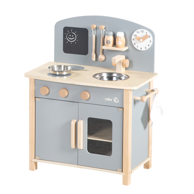 La cucina da gioco roba è una vera meraviglia. Perché un vero talento culinario sviluppa le sue capacità anche in una piccola cucina per bambini. Non ci sono limiti all'immaginazione e il vostro bambino si divertirà molto a preparare i propri piatti. Ha un fornello con 2 zone di cottura, un forno, un armadio e un lavandino con un rubinetto con 2 manopole decorative. Proprio come in una vera cucina, le 3 manopole per il piano cottura e il forno possono essere girate. La finestra trasparente sul forno permette al bambino di tenere d'occhio il cibo o la torta. Con l'aiuto dell'orologio e delle sue lancette rotanti, l'apprendimento è incoraggiato in modo giocoso. Il design semplice con una piccola superficie di bordo, i dettagli in malva/rosa e la preziosa etichettatura roba, rendono la cucina per bambini un eye-catcher. La spaziosa cucina giocattolo offre un sacco di spazio. C'è spazio nell'unità per la spesa e la vasta gamma di accessori da cucina ( padella, frusta, cucchiaio, spatola, strofinaccio, sale e pepe). Quindi nulla impedisce di iniziare subito a giocare! La cucina per bambini viene consegnata smontata. Il montaggio è un gioco da ragazzi. Dettagli del prodotto: Dimensioni (lunghezza x larghezza x altezza): 30 x 52 x 63 cm La cucina è composta da: Cucina a 2 fuochi, forno, armadio, lavandino, rubinetto con 2 manopole decorative, 3 manopole girevoli per cucina e forno, orologio con lancette girevoli. Accessori: padella, frusta, cucchiaio da cucina, spatola, canovaccio, saliera e pepiera Materiale: compensato, legno massiccio, MDF (laccato) Peso: 6,3 kg Età: da 3 anni Attenzione Non adatto ai bambini sotto i 3 anni. Pericolo di soffocamento a causa di piccole parti che possono essere inghiottite