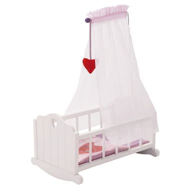 Dettagli: incl. baldacchino in voile con cuore pendente, Metal asta per baldacchino 1x biancheria da letto (cuscino e piumone) stampata con motivo a cuore Materiale: MDF verniciato bianco Testate del letto con fresatura in stile country, fresatura a cuore nella testata del letto anteriore Dimensioni: H senza/con baldacchino 29/68, L x L: 35 x 52 cm