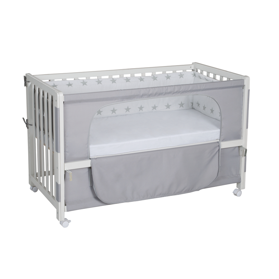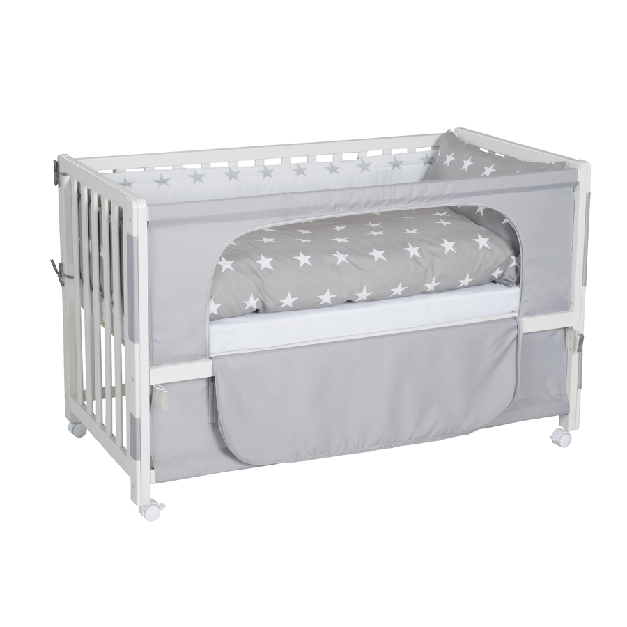 La culla Room Bed di roba permette a bambini e genitori di trascorrere tanto tempo insieme. Con un semplice gesto si adatta al letto dei genitori e diventa un lettino co-sleeping. La superficie di riposo (60x120 cm) e l'asta in metallo sono regolabili in altezza per affiancare la culla al letto dei genitori. Grazie alla pratica cerniera, la superficie laterale in Canvas si può aprire in ogni momento. Così la mamma può stare sempre vicina al suo bambino, sia di giorno che di notte. Con rotelle incluse per una maggiore mobilità. Soffice e morbido grazie al set biancheria a marchio roba incluso. Dettagli del prodotto: Lettino Colore: bianco/grigio Materiale struttura: compensato, laccato Dimensioni: larghezza x lunghezza x altezza: 66 x 126 x 157 cm Doghe regolabili in 6 altezze Tessuto laterale apribile Materiale: poliestere, canvas Utilizzabile come lettino co-sleeping, culla o letto Con ganci in metallo per un fissaggio sicuro al letto Ruote bloccabili Portata fino a 35 kg Per vasche da bagno con una superficie interna di 22 - -43 cm Materasso: Dimensioni: Larghezza x Lunghezza 60 x 120 cm Materiale della fodera: 100% cotone Materiale imbottitura: Poliestere Set biancheria Colore: bianco/grigio Fantasia: Little Stars Set biancheria: copripiumino 100 x 135 cm / federa cuscino 40 x 60 cm Materiale: 100% cotone Paracolpi per lettino Materiale: 100% cotone Materiale imbottitura: 100% poliestere Baldacchino Baldacchino Materiale: 100% poliestere (velo)/ 100% cotone (tessuto) Incluso nella consegna: Lettino con inserto laterale in tessuto apribile Sponda laterale aggiuntiva in legno, senza aste di scorrimento Materasso Paracolpi e set biancheria Asta e velo baldacchino Ruote bloccabili Attenzione: cuscino e piumino non sono inclusi!