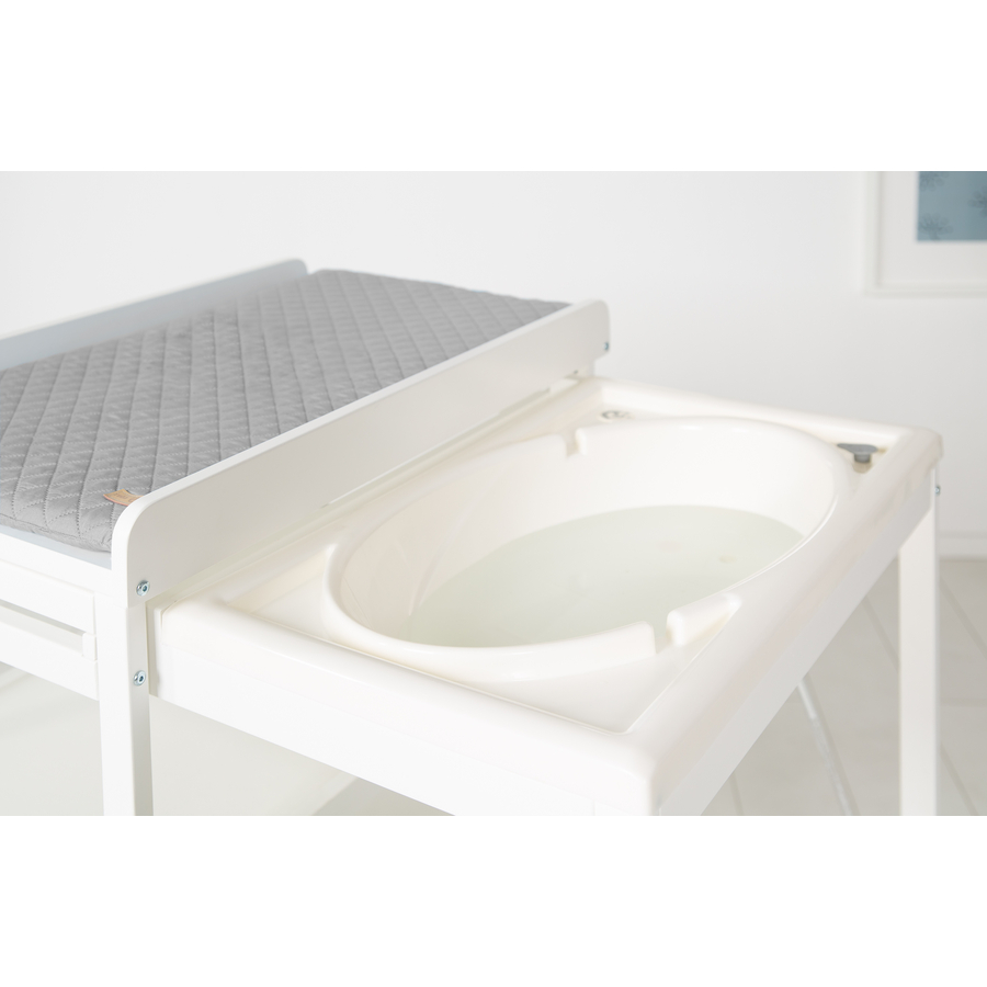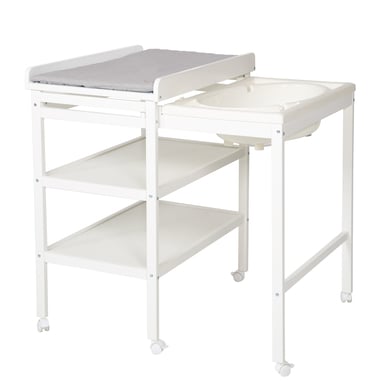 Con le sue dimensioni ridotte è poco ingombrante e pratico allo stesso tempo. Il fasciatoio in legno laccato bianco si adatta ad ogni ambiente grazie al suo design semplice . Può essere trasformato da fasciatoio a postazione bagnetto con un semplice gesto. La vasca da bagno integrata può essere facilmente estratta grazie alle ruote e spinta sotto la superficie di cambio per risparmiare spazio. La piacevole altezza del fasciatoio di 93,5 cm rende la cura del bambino un piacere per genitori e bambini stessi. Il tubo di scarico della vasca da bagno facilita lo scarico dell'acqua senza dover spostare la vasca. Inoltre, la combinazione bagno e fasciatoio è dotata di 6 ruote con freno per un facile spostamento e di due vani portaoggetti per riporre tutti gli utensili necessari per la cura. È morbidamente imbottito in modo che il vostro bambino si stenda comodamente. Il tessuto superficiale del fasciatoio con piano idrorepellente e antisporco è particolarmente delicato per la pelle e coccoloso. La serie di alta qualità roba Style offre prodotti per neonati dotati di tessuti in microfibra trapuntata di facile manutenzione. I prodotti convincono per il loro look trendy, che può essere integrato in qualsiasi soggiorno o stanza per bambini e e per la loro piacevole sensazione di morbidezza. È sviluppata in Germania ed è conforme agli attuali standard di sicurezza secondo la norma EN 12221-1+2:2008+A1:2013. Tutti i materiali utilizzati sono testati per le sostanze nocive, certificati e regolarmente testati. La superficie del fasciatoio è facile da pulire. Dettagli del prodotto: Con vasca da bagno estraibile 2 ripiani 6 rulli frenanti Piacevole altezza di avvolgimento Dettagli tecnici: Ripiano cambiacolori: bianco Tappetino: grigio Dimensioni del fasciatoio: larghezza x lunghezza x altezza 57,5 (89,5 con vasca da bagno estratta) x 82,5 x 99 cm Altezza variabile: 93,5 cm Dimensioni area di avvolgimento: lunghezza x larghezza 82,5 x 51 cm Materiale del fasciatoio: Legno laminato M