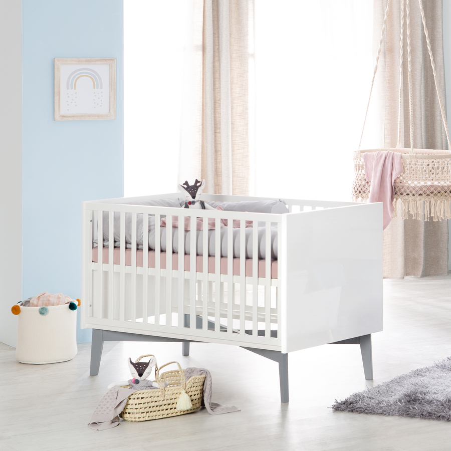 Dettagli del prodotto: Colore: bianco Regolabile in altezza in 3 posizioni 3 pioli di scorrimento Con piedi grigi in stile retrò Trasformabile in letto Junior con pannelli di conversione disponibili separatamente Materiale e cura: Materiale frontale: MDF, laccato Materiale sbarre laterali: faggio massiccio, laccato Materiale piedi: faggio massiccio, laccato Dimensioni e peso: Superficie di sdraio: larghezza x lunghezza 70 x 140 cm Dimensioni: larghezza x lunghezza x altezza 75,5 x 144 x 92 cm Capacità di carico: fino a 50 kg Incluso nella consegna: Culla Rete a doghe Attenzione: il materasso, i pannelli di conversione e le decorazioni non sono incluse nella fornitura.