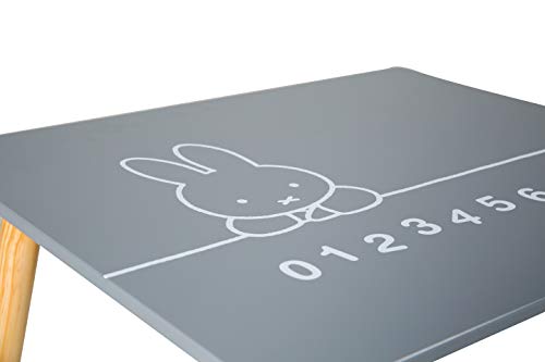 Le superfici di seduta delle sedie per bambini e il piano del tavolo sono laccate in grigio scuro. Il piano del tavolo è inoltre decorato con un simpatico viso di Miffy e i numeri 0 - 9.