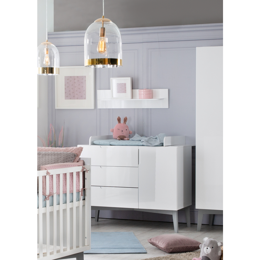 Con la sua altezza di 93 cm che facilita la schiena, il fasciatoio bianco 'Retro 2' con fasciatoio rimovibile rende la cura del bambino un piacere per i genitori e il bambino. Grazie alla disposizione spaziosa della cassapanca (3 cassetti aden, 1 porta), tutti gli utensili per il cambio e gli accessori del bambino sono sempre a portata di mano. Un alto speciale light di questo fasciatoio sono i frontali bianchi lucidi e i piedini retrò in tinta grigia. Fasciatoio con attacco per fasciatoio che cresce con il bambino: per i bambini dell'asilo, serve come sedile rialzato in modo da poterli aiutare facilmente a vestirsi in una comoda posizione in piedi. Più tardi, può essere usato come cassettiera nella camera dell'adolescente. Con ulteriori mobili per bambini della serie 'Retro 2', è possibile creare una straordinaria stanza per bambini o neonati su modern . Dettagli del prodotto: Tappetino di cambio rimovibile senza viti visibili nella piastra superiore l'unità di cambio può essere montata a destra/centro/sinistra 1 porta con funzione di chiusura morbida 3 cassetti aden con funzione di chiusura morbida Cassetto superiore con estrazione totale Dettagli tecnici: Colore: bianco Dimensioni: larghezza x altezza x profondità 117,5 x 103 x 55 cm Dimensioni con fasciatoio: larghezza x altezza x profondità 117,5 x 103 x 78 cm Profondità con/senza fasciatoio: 78/55 cm