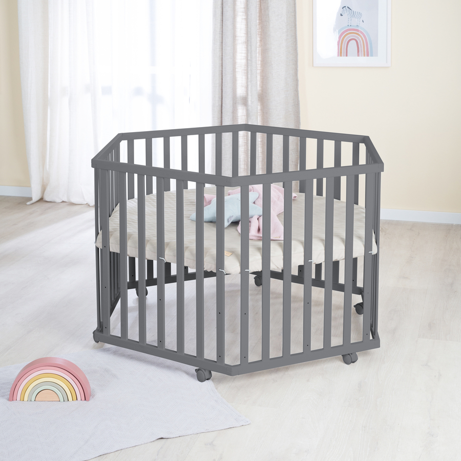 Dettagli del prodotto: Inserto protettivo incluso Colore: antracite / grigio trapuntato Superficie di sdraio regolabile in altezza in 3 posizioni e quindi particolarmente favorevole alla schiena dei genitori Tanto spazio per giocare Design moderno Capacità di carico fino a 15 kg Inserto di base imbottito in pelle vegana trapuntata e facile da pulire Il legno, adatto ai bambini e privo di schegge, garantisce una maggiore sicurezza. Il box è dotato di 6 ruote con freno che garantiscono la necessaria mobilità e stabilità Dimensioni e peso: Dimensioni L x L x H: 103,5 x 118,5 x 72,5 cm Materiale e cura: Materiale della superficie di appoggio: MDF, materiale della base: compensato Materiale tessile: 100% poliestere;