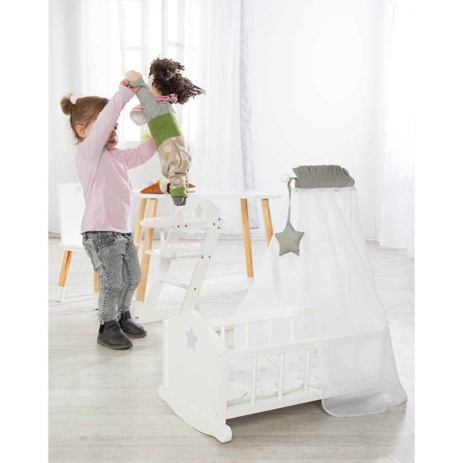 Il seggiolone per bambole Stella di roba con tavoletta da pranzo è ideale per i piccoli genitori delle bambole, in modo da poter pranzare e giocare con le loro bambole. La sedia per bambola in legno bianco con cuscino di seduta grigio e motivo a stella bianca è un must-have per la mamma della bambola. In abbinamento a questo seggiolone per bambole ci sono numerosi altri accessori per bambole della nostra serie Stella. L'amorevole stampa del cuscino di seduta conferisce a questo seggiolone per bambola laccato bianco un delicato stile da casa di campagna. Il seggiolone della bambola viene consegnato smontato. Il montaggio è un gioco da ragazzi. Il pratico seggiolone per bambole Stella è stato sviluppato secondo la norma di sicurezza europea per i giocattoli EN 71-1:2014 + A1:2018 in Germania ed è consigliato come gioco di ruolo per bambini a partire da 3 anni. Materiali testati e certificati. Regolarmente testati dal produttore. Le superfici si possono pulire facilmente mentre il tessuto può essere lavato in lavatrice. Dimensioni del seggiolone per bambole: 51,5 x 28 x 28 cm Dettagli: Seggiolone bambola con tavoletta da pranzo Cuscino di seduta in tessuto a stella incluso Materiale struttura: Fibra di legno MDF laccato bianco Dimensioni: 51,5 x 28 x 28 cm Età: a partire da 3 anni