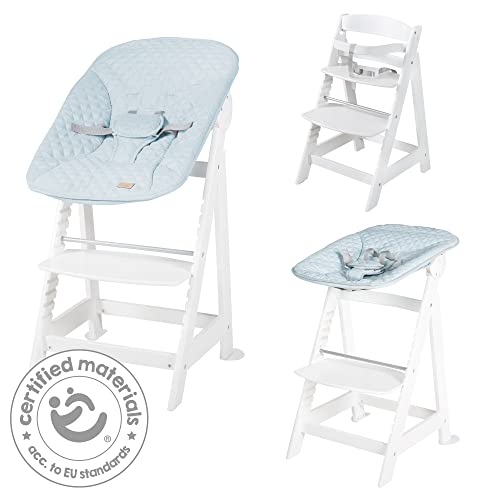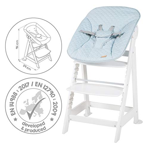 Roba Seggiolone Evolutivo Born Up 2 in 1, Sdraietta roba Style Azzurra Reclinabile, Fodera Impermeabile, Altezza Regolabile, Robusto e Resistente, Ergonomico, fino ai 70 kg, Legno Laccato Bianco