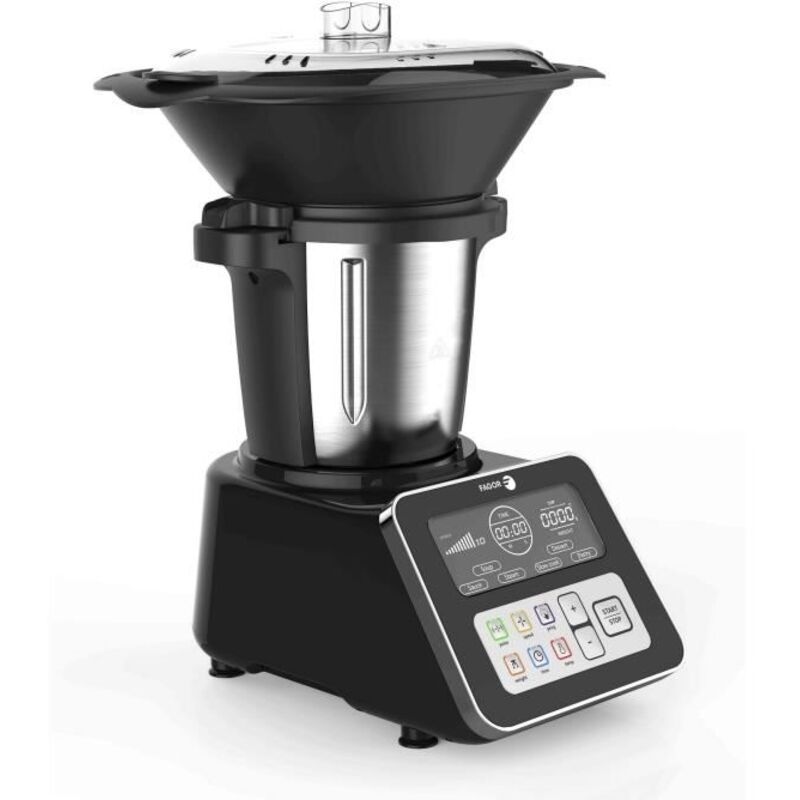 Robot da cucina Fagor FG1500. Potenza: 1500 Watt. Colore nero. Materiale della ciotola: acciaio inossidabile. Capacità ciotola: 2,5 lt. Numero di velocità: 12 velocità + impulso. 4500 giri/min. Timer da 100 minuti. Scala integrata. Temperatura 20-120°. Schermo LCD extra large. Molti programmi preregistrati. Fornito con 1 spatola, 1 lama tritatutto, 1 coprilama di miscelazione, 1 coperchio con tappo dosatore da 90 ml, 1 ciotola vapore, 1 farfalla e 1 cestello. Dimensioni: 43 x 32 x 50 cm. Peso: 7,3 kg.