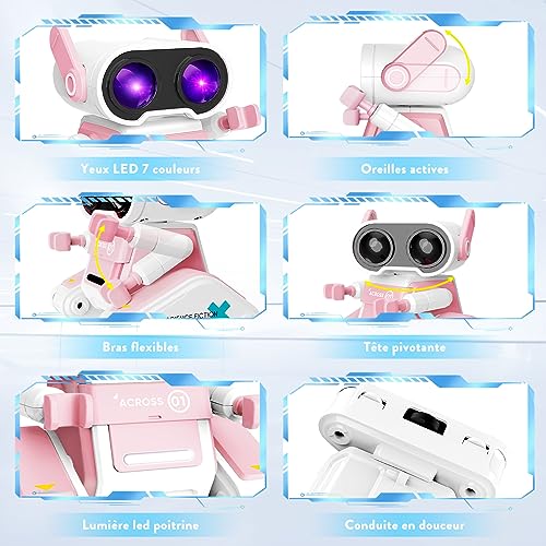 【Robot multifunzionale】questo robot tecnologico dal design carino può parlare la propria lingua quando è acceso, gli occhi a LED hanno 7 colori diversi, dotati di musica diversa, la parte anteriore si illumina e ha braccia, orecchie e capo reparto mobili. Può essere riprodotto tramite telecomando a lunga distanza, rotazione a 360° e riproduzione musicale in modalità automatica