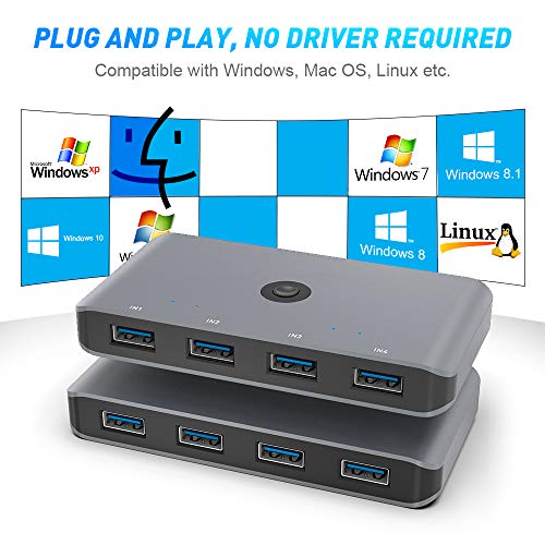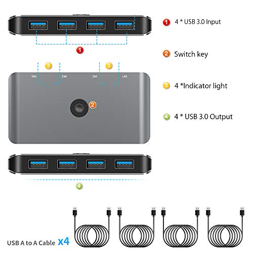 Rocketek 4 Porte USB 3.0 Switch per 4 PC,Commutatore USB Switch 4 Ingressi 4 Uscite per Condividere Mouse,Tastiera,Hard Drive, Stampante, con scambio a un pulsante e cavo maschio da 4 pezzi