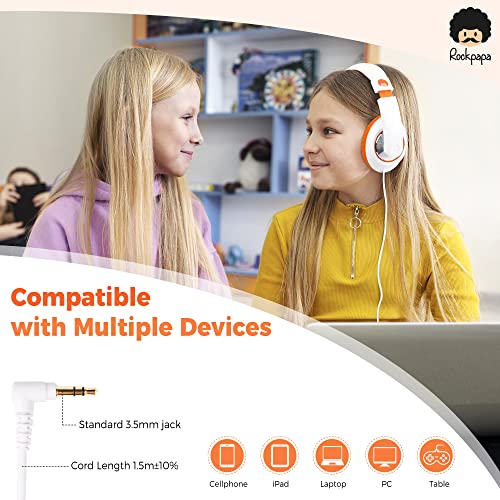 RockPapa Comfort Cuffie per Bambini Over Ear, Cuffie con Filo per Ragazzi Bambina, Cuffie Jack 3.5 mm Stereo per Scuola/Viaggio/Telefono/PC, Bianco Arancio