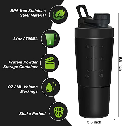 ROCKY&CHAO Shaker proteico in acciaio inox, 700 + 200 ml, con scomparto per polvere per sport e fitness, albume d'uovo, bottiglia di proteine (nero)