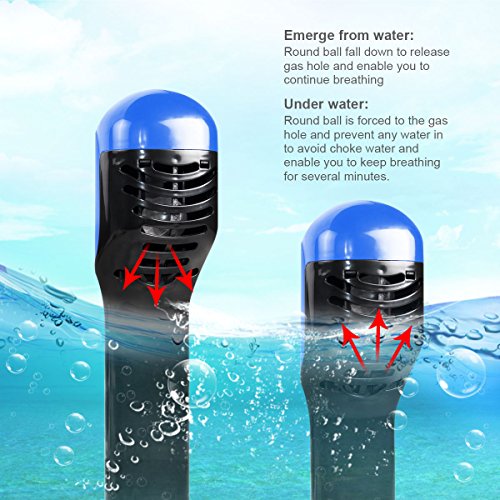 【Tecnologia Dry Snorkel + Anti-Leak】 Non c'è più soffocamento neanche quando si fa snorkeling con le mani verdi. Il foro d'aria sarà chiuso quando il tubo dello snorkel è immerso nell'acqua e fornirà alcuni minuti dall'aria nella maschera, e il foro d'aria si riaprirà una volta che il tubo dello snorkel si trova nella superficie dell'acqua