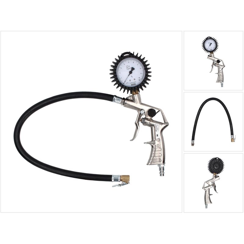Contenuto della consegna: - 1 gonfiatore di pneumatici Rodcraft RF02G - 1 tubo flessibile da 500 mm Descrizione del prodotto: Con l'RF02G, Rodcraft offre un gonfiatore per pneumatici con un manometro calibrato e un tubo flessibile lungo 500 mm con tappo a vite. Il gonfiatore di pneumatici è progettato per 0 - 10 bar ed è dotato di un manometro da 60 mm con protezione antiurto. La leva viene utilizzata per gonfiare il pneumatico e l'aria può essere rilasciata nuovamente con il pulsante. Rodcraft è uno dei principali produttori di utensili ad aria compressa e attrezzature per officina, caratterizzato da una lunga tradizione e da un'elevata qualità di lavorazione. Specifiche tecniche: Produttore: Rodcraft Designazione del produttore: RF02G Numero del produttore: 8951011019 Categoria di utensili: gonfiatore per pneumatici. Lunghezza: 250 mm Peso netto: 0,41 kg Consumo medio di aria: 1,7 l/s Consumo medio di aria: 100 l/min Consumo effettivo di aria: 5 l/s Consumo effettivo di aria: 300