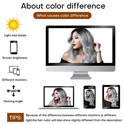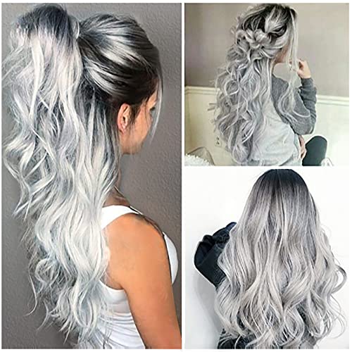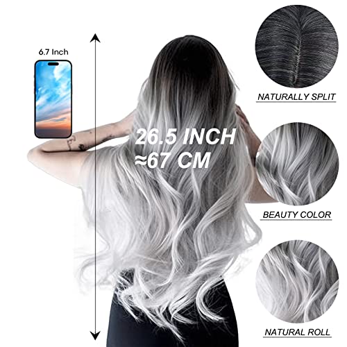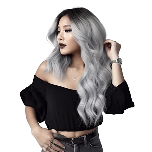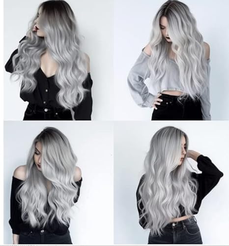 RODIISKY Parrucche Grigio Argento Gradiente Parrucca ondulata riccia Parrucca lunga grigia per donne con radici nere Tutti i giorni Cosplay Costume Party Halloween Parrucca grigia 26 pollici.