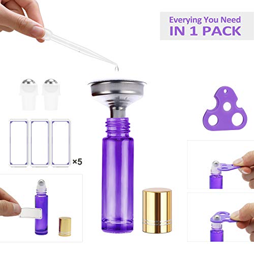 Roll On Vuoto per Oli Essenziali, Profumi, 10ml - Sfera in Acciaio Inossidabile, Confezione da Regalo per Ogni Bottiglietta, Accessori Inclusi, Handy Picks (Viola, 7 Pezzi)