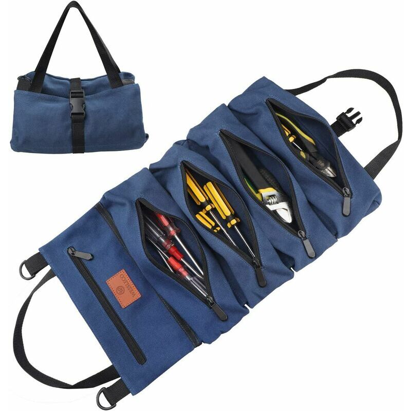 Ben progettato - Gli strumenti per bobina sono realizzati in tela 16A resistente, leggera e durevole. RIMANI ORGANIZZATO: 5 tasche con cerniera organizzano le tue piccole pinze, chiavi inglesi, cacciaviti, prese, pinze e morse, calibri o strumenti piatti per mantenere tutte le tue prese organizzate. Dimensioni perfette: dimensioni estese: 47 x 27,9. Cerniera e fibbia lo rendono facile da arrotolare e trasportare. Design funzionale: molto pratico per proteggere/trasportare i tuoi attrezzi. Perfetto se sei un appaltatore, un riparatore HVAC, un falegname, un idraulico, un costruttore di telai o un elettricista.