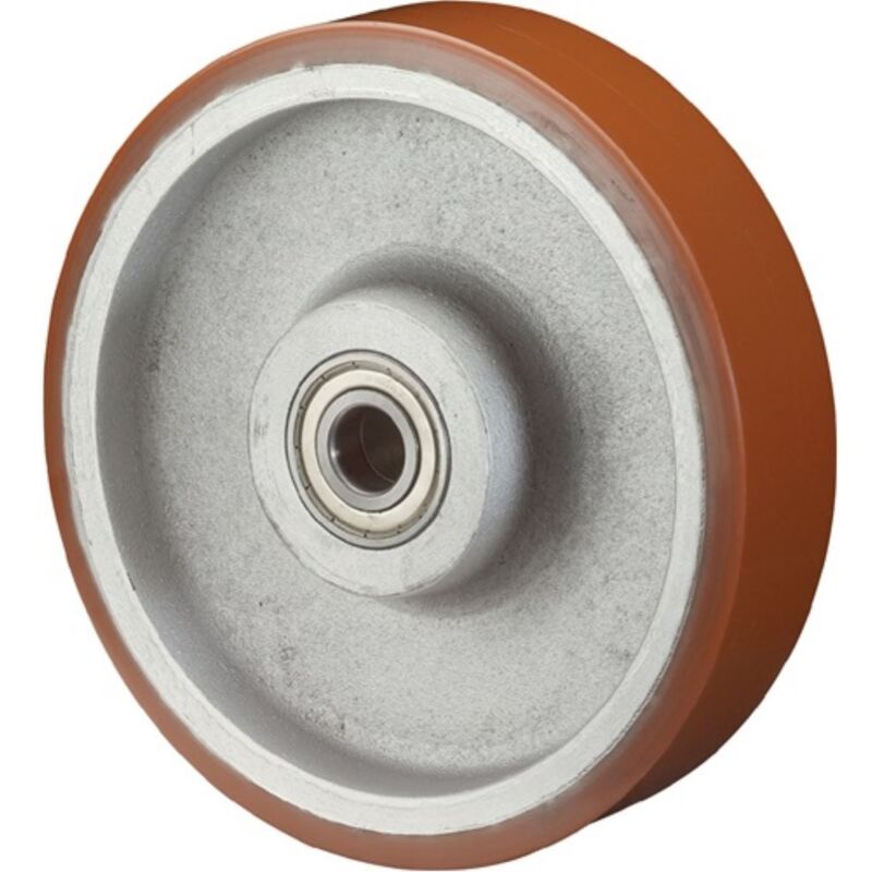 Per doppi rulli sterzanti e buck · Benda in poliuretano (marrone) sul corpo ruota fusa · 95 +/- 3 Riva A · Cuscinetti a sfera · resistente alla benzina, al diesel, agli oli e ai grassi vegetali e animali