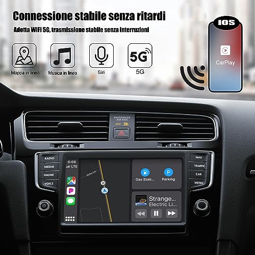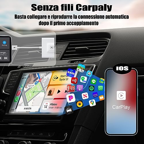 【Adattatore wireless CarPlay】 Non sono più necessarie connessioni cablate, ora è così facile convertire il tuo CarPlay cablato in wireless con il dongle wireless Teran CarPlay! Puoi comunque goderti l'intera funzione CarPlay e mantenere il funzionamento originale del veicolo come navigazione, riproduzione musicale, assistente Siri, telefonate, ecc. (compatibile solo con ios CarPlay, non per altri sistemi).